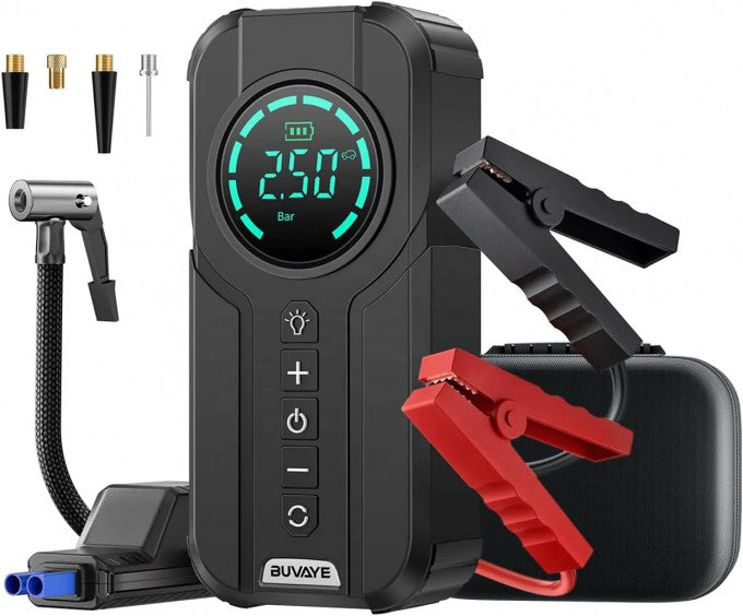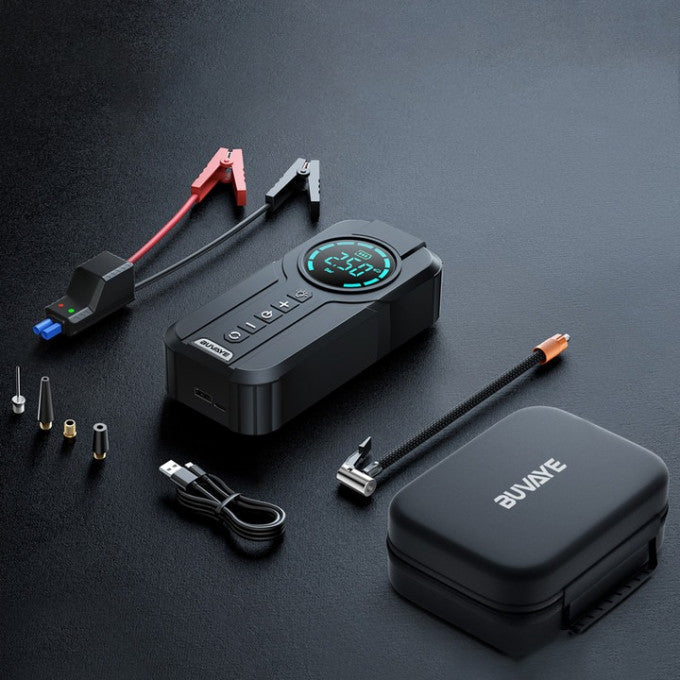 Многофункциональное аварийное устройство для автомобиля 4-в-1: пусковое устройство, компрессор, зарядное устройство, светодиодный фонарь.