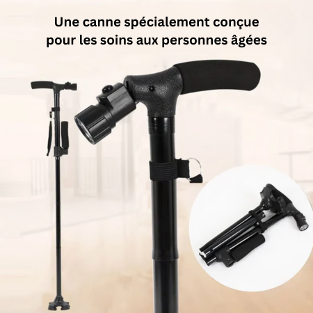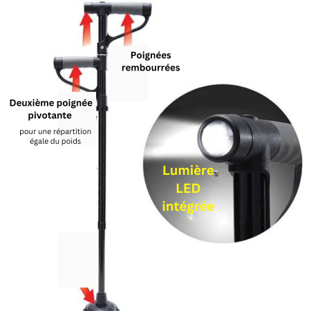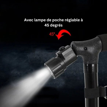 La particularité de la canne est qu'elle est équipée d'une lumière intégrée à 3 LED qui peut être dirigée directement devant vous ou vers le bas pour éclairer le chemin. La poignée spécialement conçue offre une prise confortable et ferme et la canne peut être ajustée à votre taille.