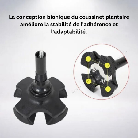 L'extrémité d'une canne ordinaire peut glisser lorsque vous marchez, mais le pivot unique de cette canne lui permet de se déplacer avec vous, tandis que la tête à triple poignée offre une bonne prise. La canne se plie pour être facilement transportable.