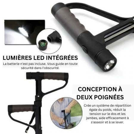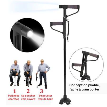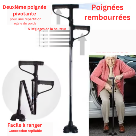 Canne à fonction unique avec deux poignées pivotantes pour un soutien et un appui maximum en position assise et debout. Se plie de manière compacte pour les déplacements en voiture, en bus et en avion.